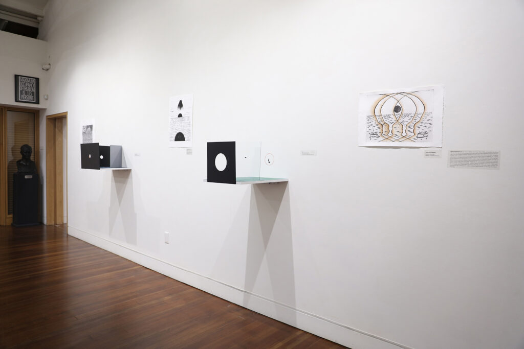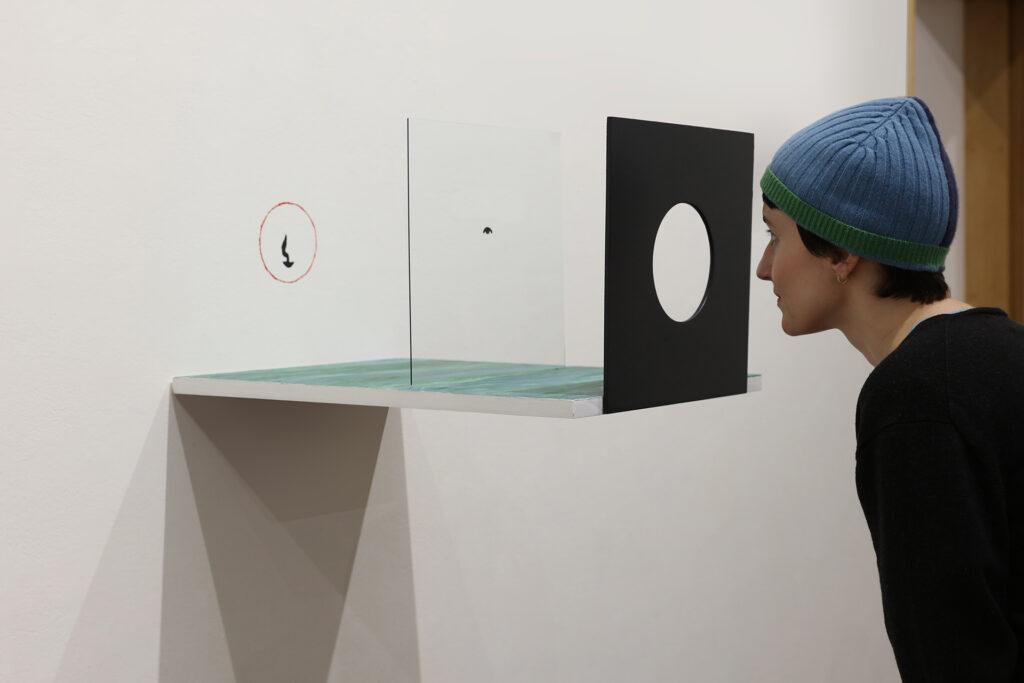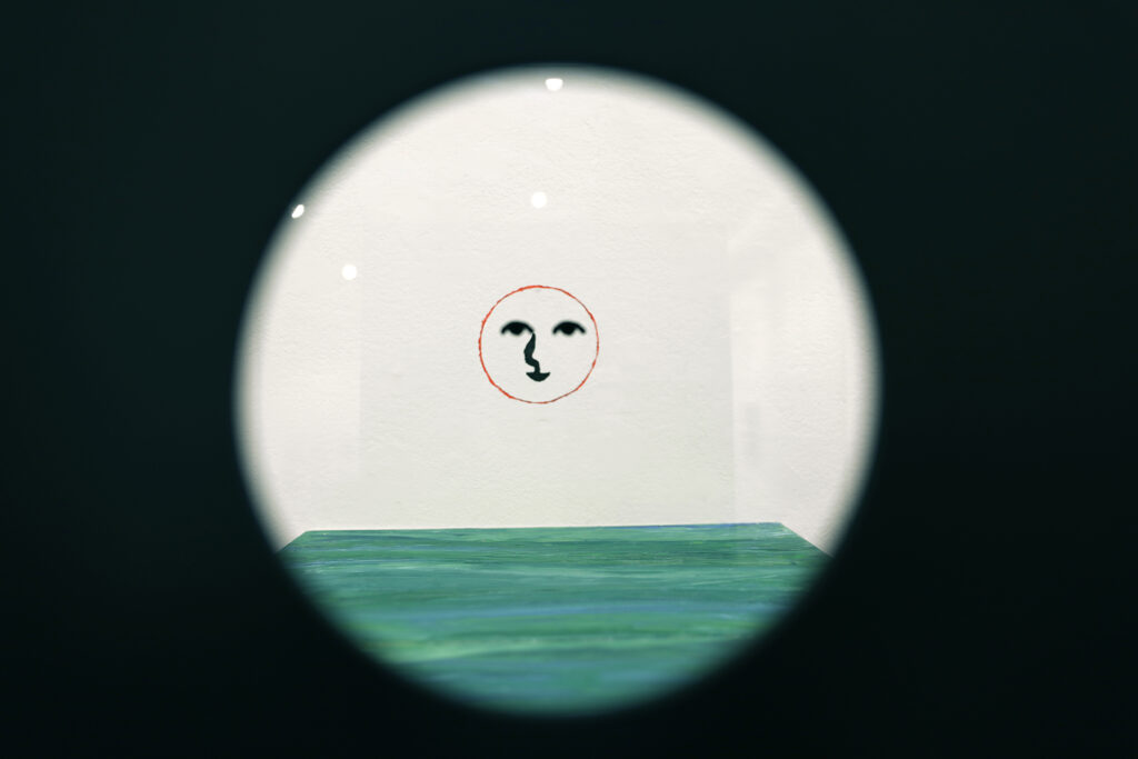 The distance between the single eye (painted on a square glass piece), the face (painted on the wall), and the view frame is designed in a way that by looking through the open frame, the single eye would gradually become two completing the face on the wall. The camera lens could not capture the human vision, so the last image was made up, in order to present the viewer’s experience.